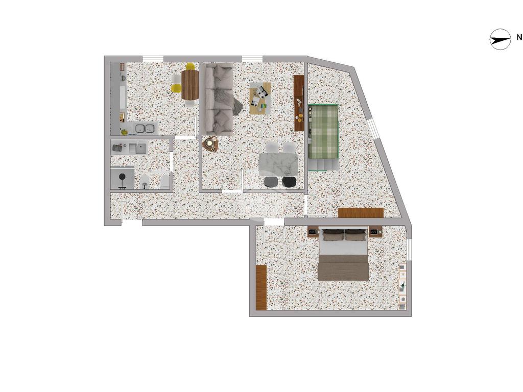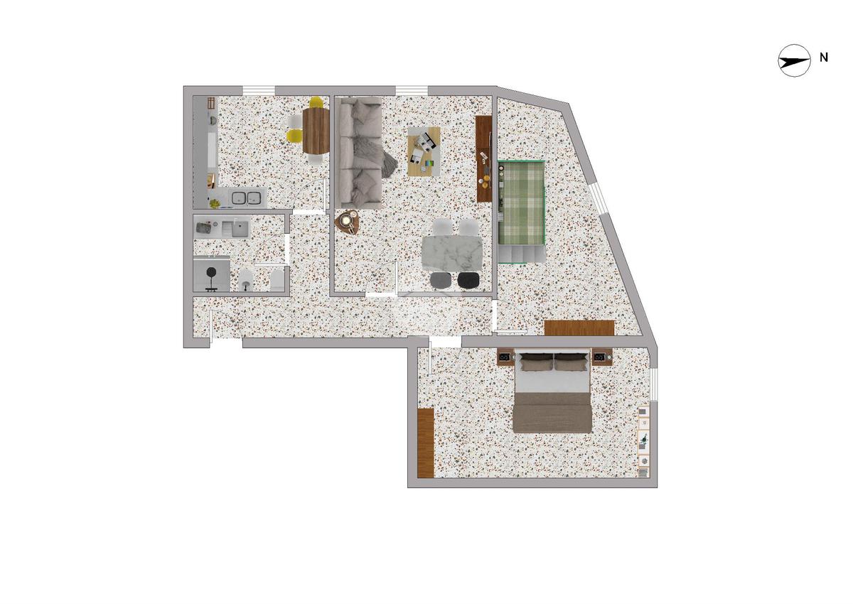 All'interno, il trilocale colpisce per la sua disposizione funzionale:cucina separata, due comode camere e un ampio soggiorno.